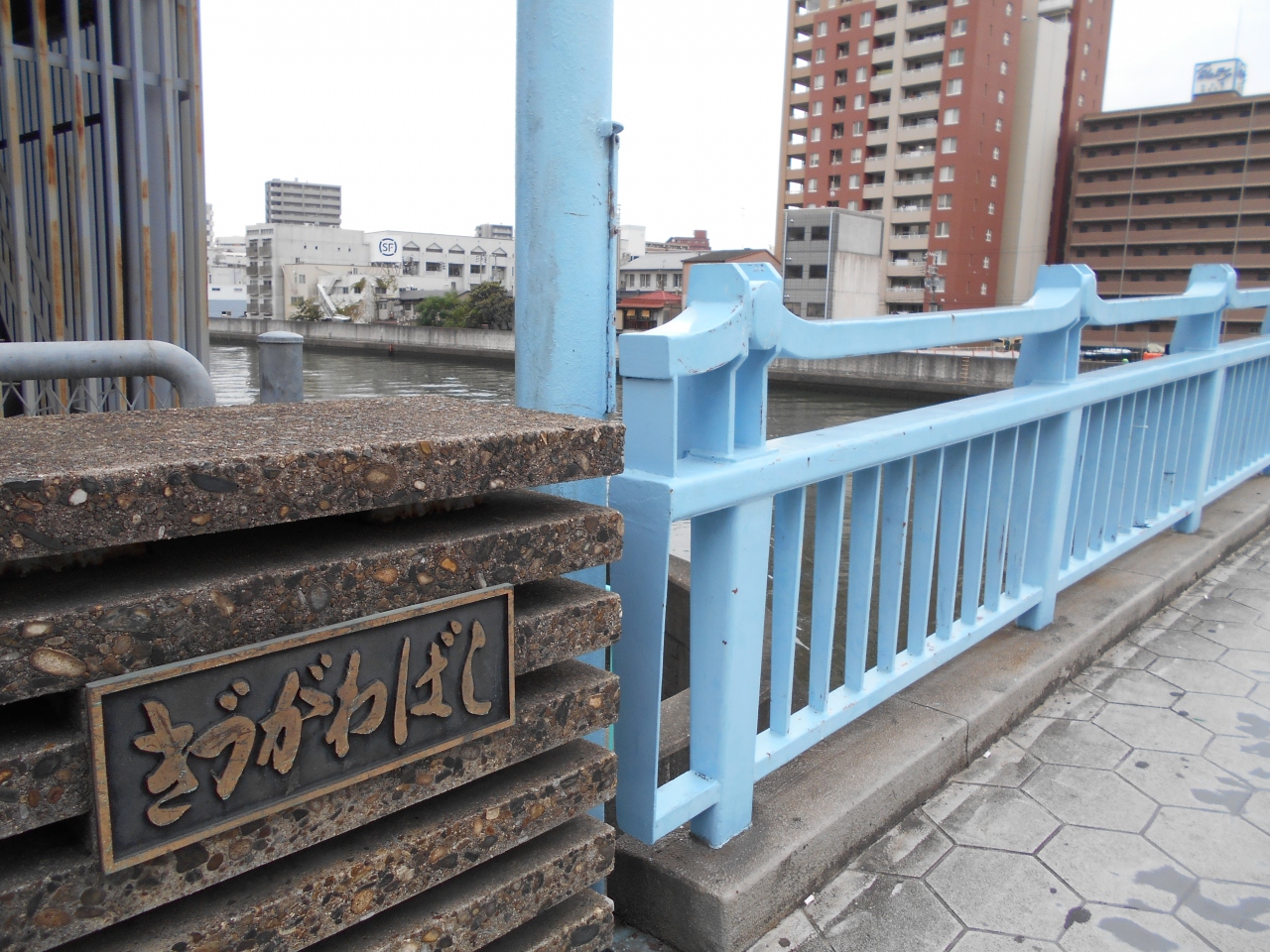 最寄は阿波座駅です。歩いて数分で川に着きます。川自体はごくふつうでした。橋も普通で車がたくさん通っています。運送関係の車も多そうでした。橋のふもとに記念碑がありました。