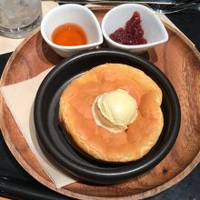 フェカルディーノ+wine 柏の葉店 のドリンクセットとは、料理にドリンクをセットで注文すると、ドリンクが50円引きになるというサービスです。金のカマンベールと生ハムのホットサンド、スフレパンケーキ ホイップバター添えをいただきました。