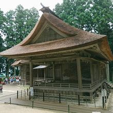 中尊寺金色堂の向かいに位置しています。朱色の鳥居をくぐり、参道を進むと茅葺きの立派な「神楽殿」が見えてきます。現在も使用しているいるようで、今年の夏にも「薪能」がこちらの舞台で行われたそうです。趣ある神楽殿、当時の雰囲気を感じながら見学しました。