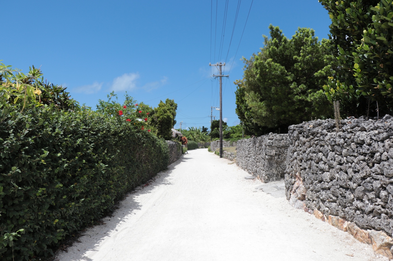 アスファル舗装されていない白い砂の道、石を積み重ねた石垣、いたるところにいるシーサーなど都会にいては堪能できない南国らしさを象徴する街並みになっています。