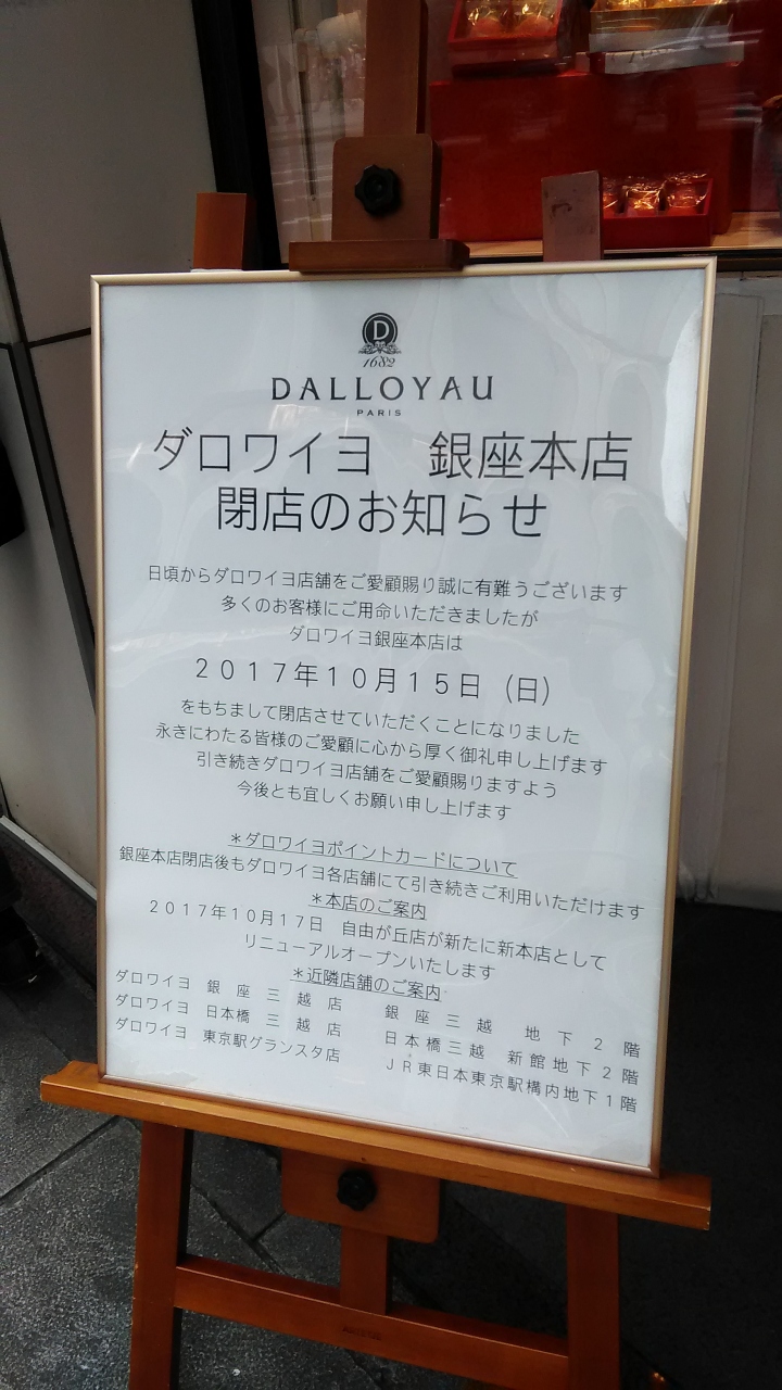 銀座ダロワイヨ本店が10月15日で閉店になります。ケーキ食べ放題に行ったり、ゆっくりお茶をするのにはよく利用していました。デパ地下ではテイクアウトできそうですが・・・。張り紙を見てとっても残念に思います。