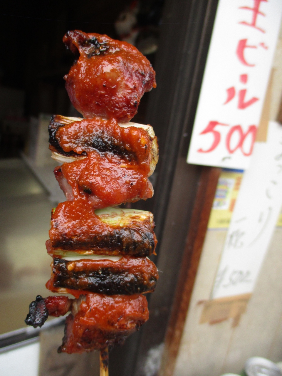 店頭にお客さんが沢山いたので立ち寄ってみたら焼き鳥に味噌を付けて売っていました。良い香りと見た目に惹かれて一本購入しました。店頭で売っているのはねぎまの焼き鳥でしたが、奥には入って食べられるスペースがあるようです。ビールの貼り紙はありましたが、他にもおつまみがあるかもしれません。