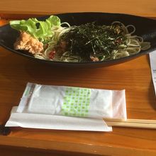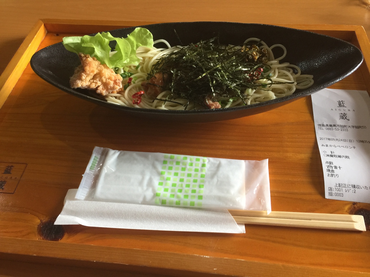 道の駅にあるお土産屋兼レストラン。1階のお土産屋で発注し、2階で座って待つというパターン。みまからペペロンチーノ859円を発注。1階、2階を2人で回しているせいか、15分くらい待たされる。細めのパスタ、というか素麺にみまからなる辛味をお好みで混ぜて食べるらしい。一気に行き過ぎたせいで汗ダラダラ。油断禁物。