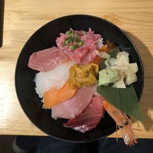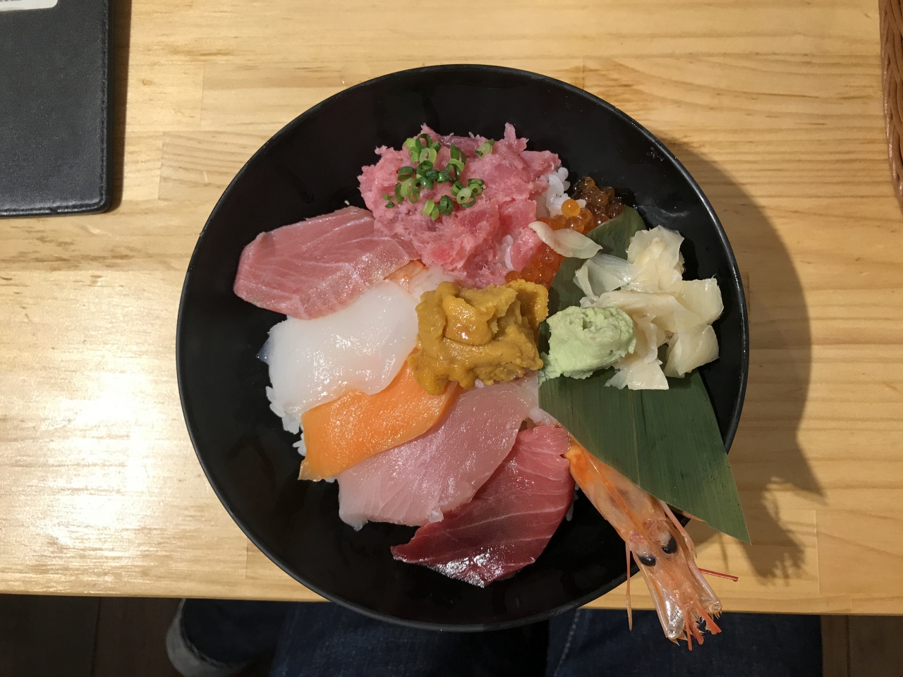 築地だけあって海鮮丼が豪華です。サーモン、うに、マグロ、エビなど食べたいお刺身が一皿で食べられるので築地にきたらとりあえずここに行けば間違いないでしょう。店頭に大きなマグロの実物が展示されていてSNS映えしますね。
