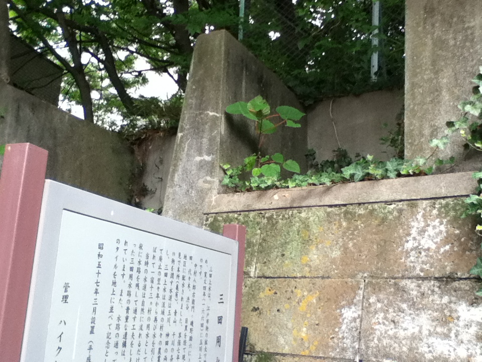 白金台駅南東、住宅地の路地横にある。石段を下りた横にあり、分かりにくい。平日午後、人通りは大変少ない。お勧めの点は、三田用水は、かつ世田谷区北沢から目黒区三田方面を経て白金猿町に流れていた用水路で農業用水等として利用されていたこと、現在この場所には用水路のコンクリートの断面が残っていて実際にあったことを実感できること、横には説明板があり地元関係者が維持に取り組んでいることに感心すること、江戸時代や明治時代にこの用水路を建設した技術者達の活躍に感心すること、周辺はマンションや戸建て住宅が並ぶ一般的な住宅地であり散策しながら白金の街並みをゆっくりみるのもいいかもしれないこと、駅から徒歩で行けることである。