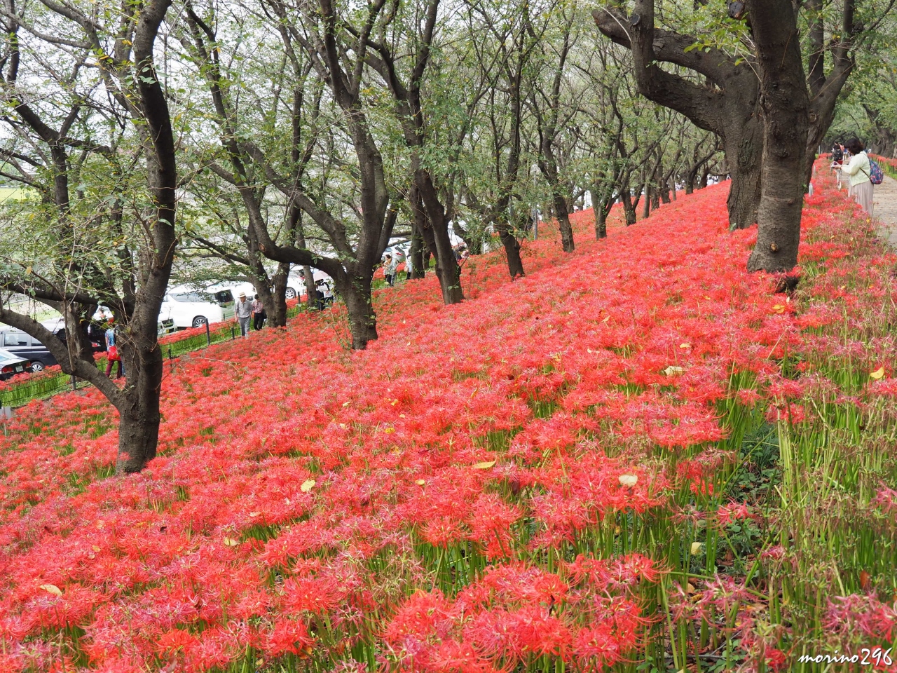 平成12年より市民ボランティアによって植栽された曼珠沙華は、現在約350万本といわれ、土手一面を真っ赤に染めます。