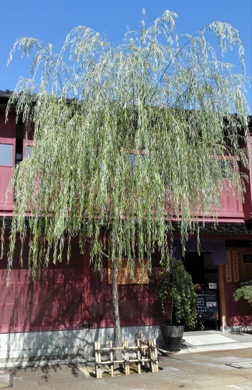 ひがし茶屋街の真ん中辺りに、紅い壁のお店が有り柳の木がステキな雰囲気で、茶屋街の記念撮影スポットです。お茶屋さんなど気軽に昼間は入れるので是非行ってほしいです。