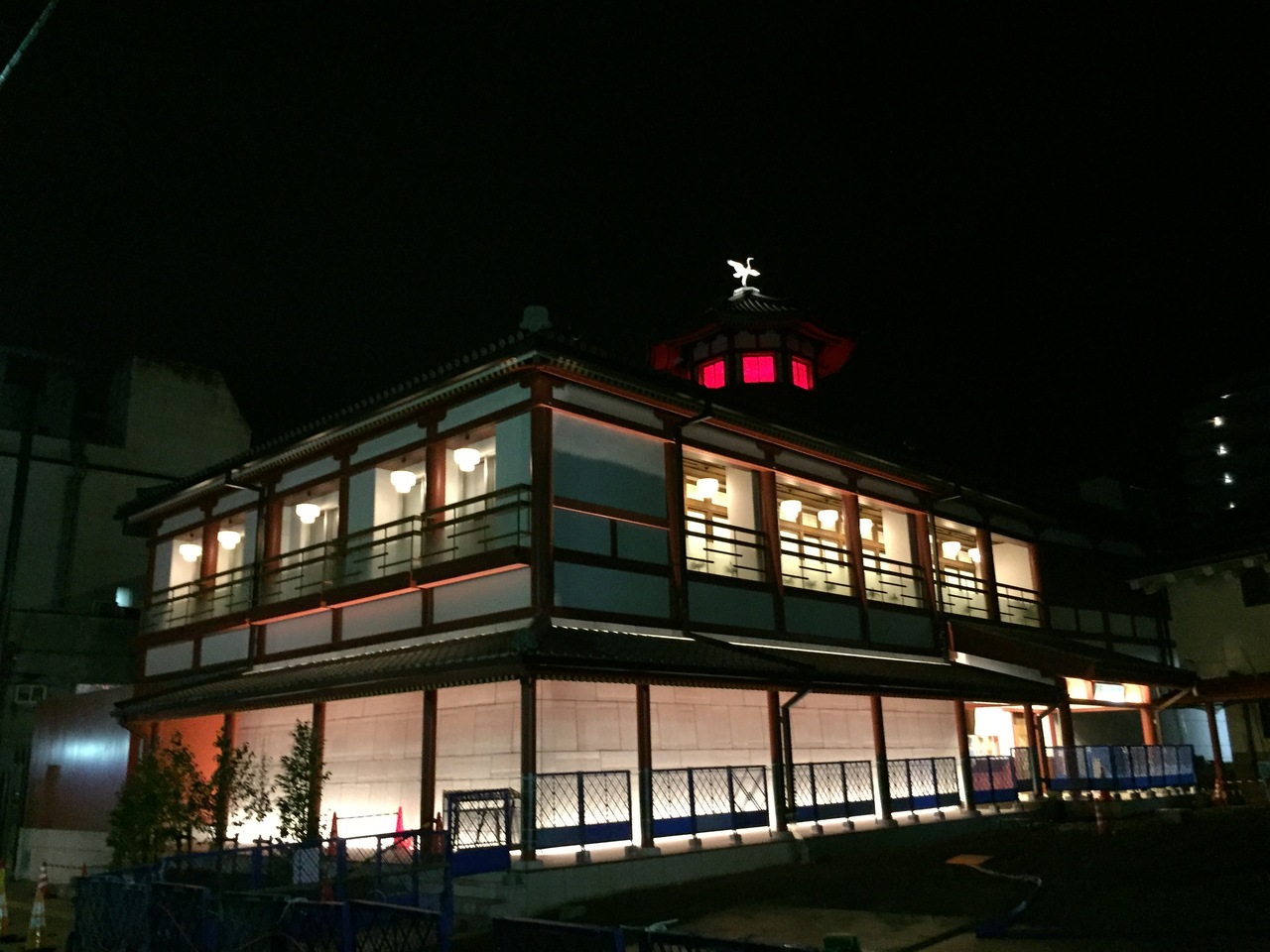いつも行く椿の湯の裏側に、飛鳥の湯がオープンしました。間の中庭はどちらからも行けるようになるようです。現在、椿の湯は改修工事中で、12/26まで閉館しています。道後温泉本館に観光客が殺到するので、市民のために作ったようなお風呂。本館1階とほぼ同じ作りで、天井も高く広々してます。一方、飛鳥の湯は今時のスーパー先頭と同じ、ロッカーキーを受け取って、洗い場がブースになっているタイプ。いかんせん狭くて天井が低く、圧迫感があります。その代わり外気に通じた半露天がある。泉質は本館2階の湯に匹敵するほど、力強い湯でインパクトがありました。本館が改修工事に入ると、飛鳥の湯だけでは到底まかないきれず、椿の湯にも観光客がなだれ込む可能性が大きく、混雑することでしょう。因みに飛鳥の湯は1階が¥600と椿の湯より高く設定され、2階大広間¥1250、個室¥1650、さらに特別浴室は1組につき¥2000と本館に似せた設定となっています。
