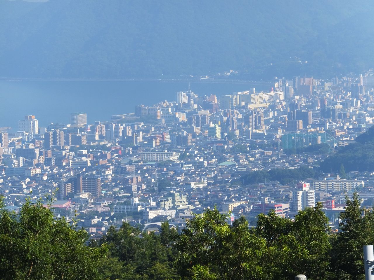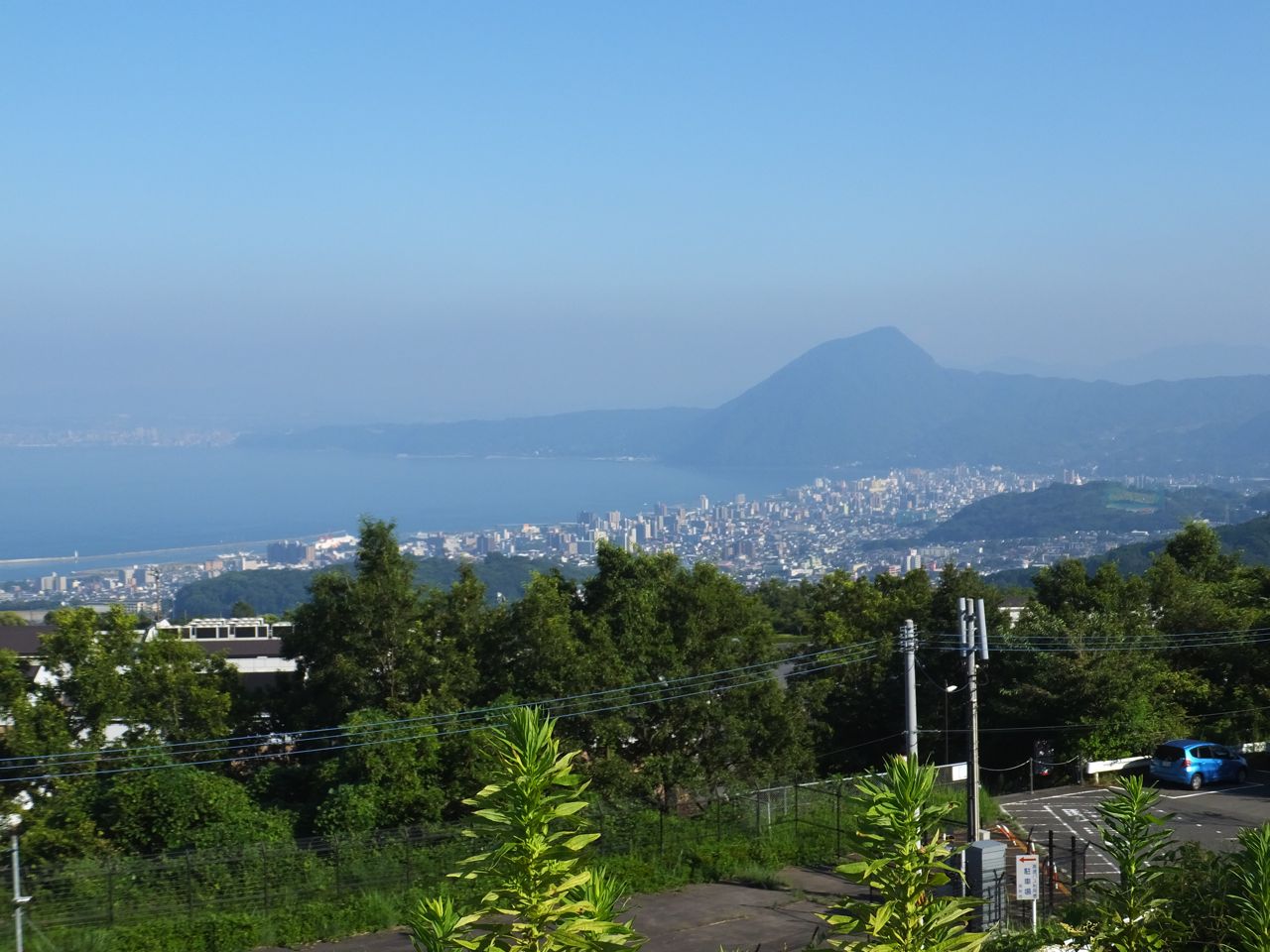 別府の町の上にあるサービスエリア。眺めはすばらしいです。手前は別府の街並。右手別府湾の向こう、高崎山の先の大分の町や工業地帯まで見えます。博多方面から来ると別府のインターで降りる手前なので、是非、展望のために寄ってみましょう。