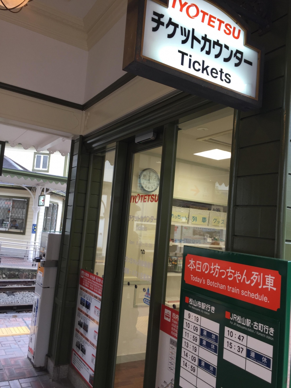 かつての面影を残しながら、利用客の便宜を図るためにリニューアル工事中です。新しくなったチケットカウンターは小綺麗で愛想の良いマドンナさんが迎えてくれます。1Dayチケットがここで買えます。坊っちゃん列車坊っちゃん列車が止まっている時もあります。