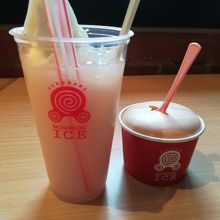 マンゴー&ミルクのアイスとピーチ&パインスムージー。