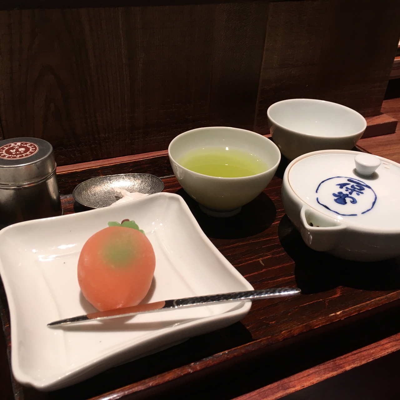抹茶、玉露、煎茶、それぞれいくつかのランクのお茶が並び、お茶にプラスでお菓子が付く。せっかく一保堂に来たのだから、それなりのお茶をと思い、1800円ほどする玉露「甘露」を選択。