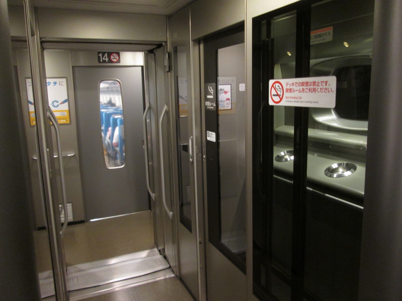 のぞみN700系は全席禁煙になっており、車輛・デッキでの禁煙は不可になっています。喫煙する場合、指定のブースで行うことになります。愛煙家の者にとって肩身の狭い思いをしますが、絶対我慢していないといけない飛行機移動よりは快適と言えます。