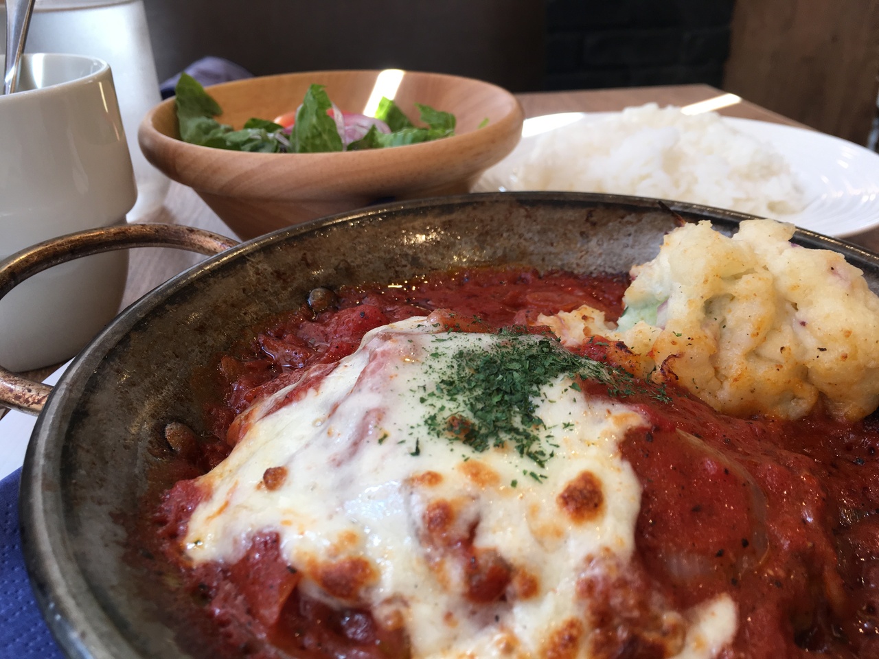 ハンバーグは完全にトマト煮込みに埋没しており、自分が何を注文したのだったか一瞬思い出せなくなった。同じ鉄板に乗せられているポテトサラダにも焼き目が付いており好印象。