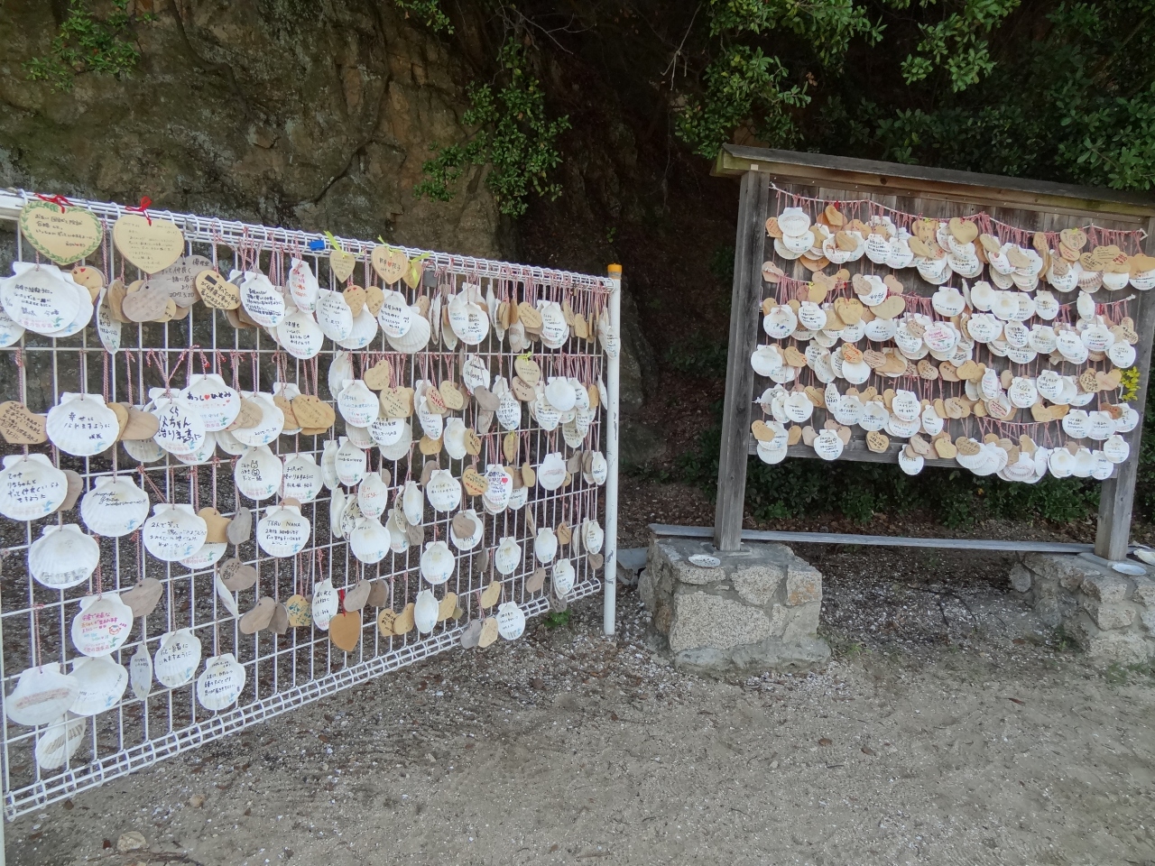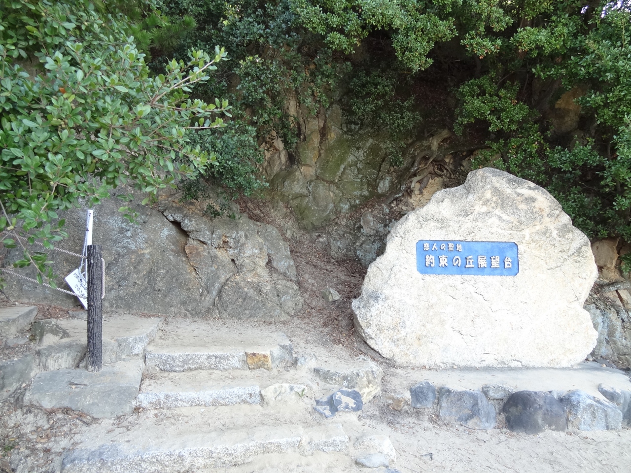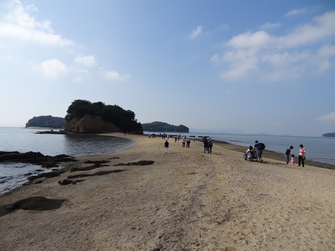 ちょうど干潮時に来られて、島まで道が伸びて歩いて渡ることができました。島まではおよそ5分もあれば到着できます。道は幅広い所で30m、狭い部分では5mほどで、家内と手を握り合って渡ってみました。何か、幸せな気分になったのは私たちだけでしょうか?島は一周できるようでしたが、時間がなくて三分の一くらいまで行ったところで引き返しました。入り口近くの丘の上には神社もあるようでした。