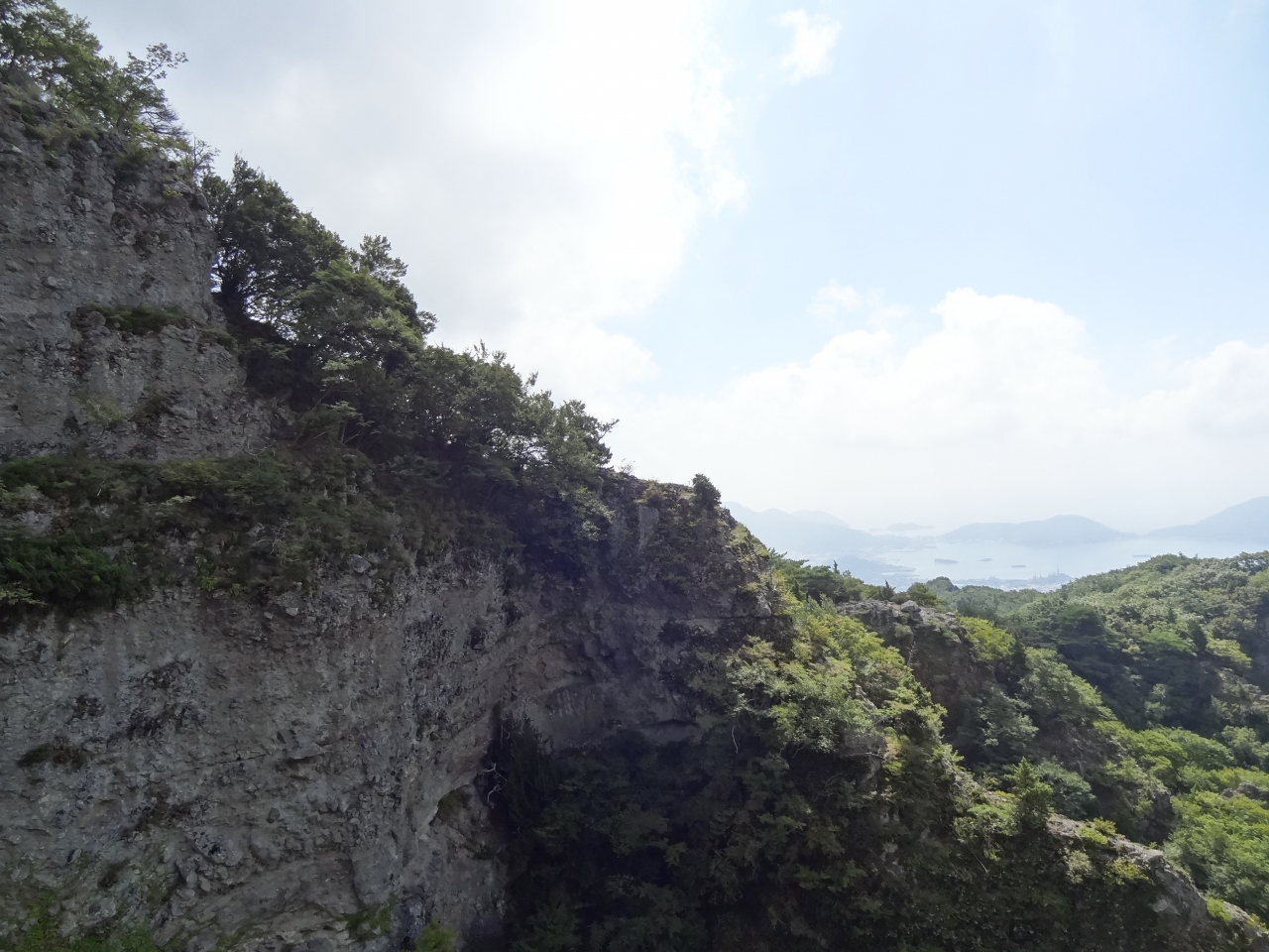 寒霞渓ロープウエイを山頂から降りたくて展望台の駐車場に到着しました。すぐ近くにはふるさと創生の一億円を使った豪華なトイレがあります。展望台とロープウエイ乗り場はすぐ近くにあります。ロープウエイに乗るまでに時間があればお土産店や瓦投げもできる展望台で時間を過ごすといいでしょう。展望台はロープウエイ乗り場の両脇に二カ所あります。ロープウエイを入れて撮影なら、左側の小さい展望台で。乗り場近くにずっとしたまで見下ろせるスポットがあるので、ここで撮影してみてください。大きい展望台からは寒霞渓の右側部分の絶景がよく見えます。少しガスがかかっていましたが、素晴らしい絶景を堪能できました。