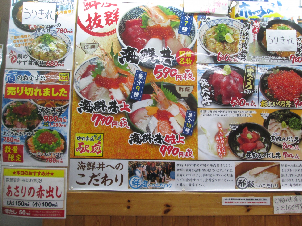 リーズナブルな値段でボリュームたっぷりの海鮮丼が食べられる人気店でした。メニューはバリエーションに富んでいてどれにしようか悩むほどでした。店内はカウンターのみで隣のお客さんとは近く、座席の後ろもやっと通れるぐらい細長かったです。
