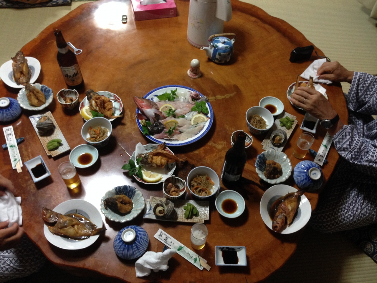 あこうと虎魚の刺身、虎魚の唐揚げ、サザエ、あこうの煮付け、