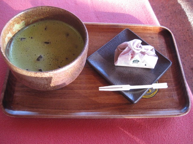 暑い日だったが、なぜかお抹茶が無性に飲みたくなって立ち寄りました。嬉しいことにアイスもあり、冷たいお抹茶をいただきました。非毛氈でいただいていると次々に観光客がやってきて、ほとんどの人はかき氷などを注文していました。