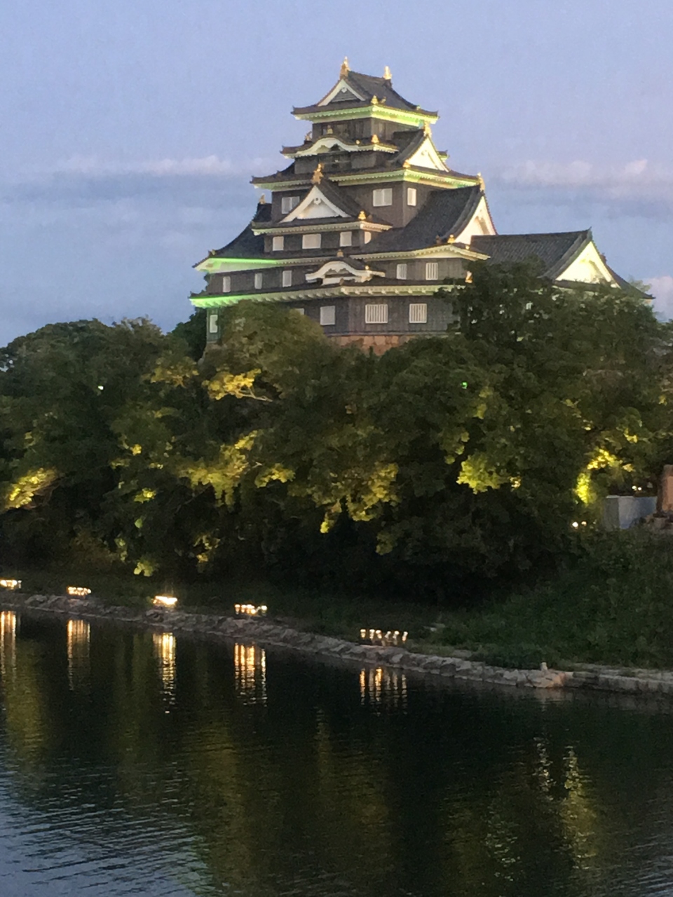 岡山後楽園南門を背に歩きながら、月見橋までやってくると、緑に輝く岡山城が浮かび上がっていた。