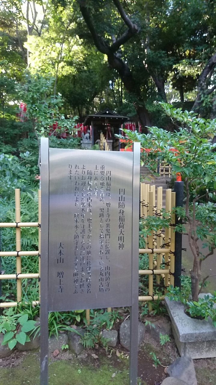 芝公園散策中に稲荷神社を見かけました。神社が建っている古墳の名称は芝丸山古墳ですが、こちらの大明神の名称は円山随身稲荷ですので、「まる」の字が違います。薄暗い林のような中にある神社ですし、古墳の上にある神社でもあるので、ちょっと怖い印象でした。ここは増上寺の裏鬼門に位置しており、山内鎮守の重要な地を占めているそうです。