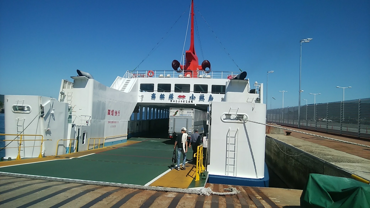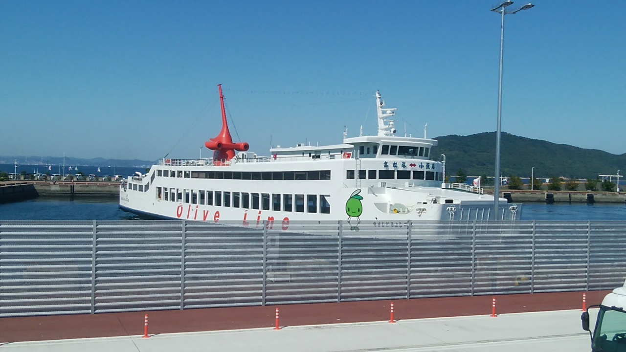 高松築港と土庄往復のフェリーに乗りました。どちらの港も高速船とフェリーの切符売り場が違うので、注意が必要です。高松の切符売り場は出発の20分前販売開始で結構人が並んでいましたが、人の乗車券だけなら自動販売機でも購入できました。切符売り場には飲食販売がありませんが、フェリーのなかでスナックやパン、うどんも食べられました。
