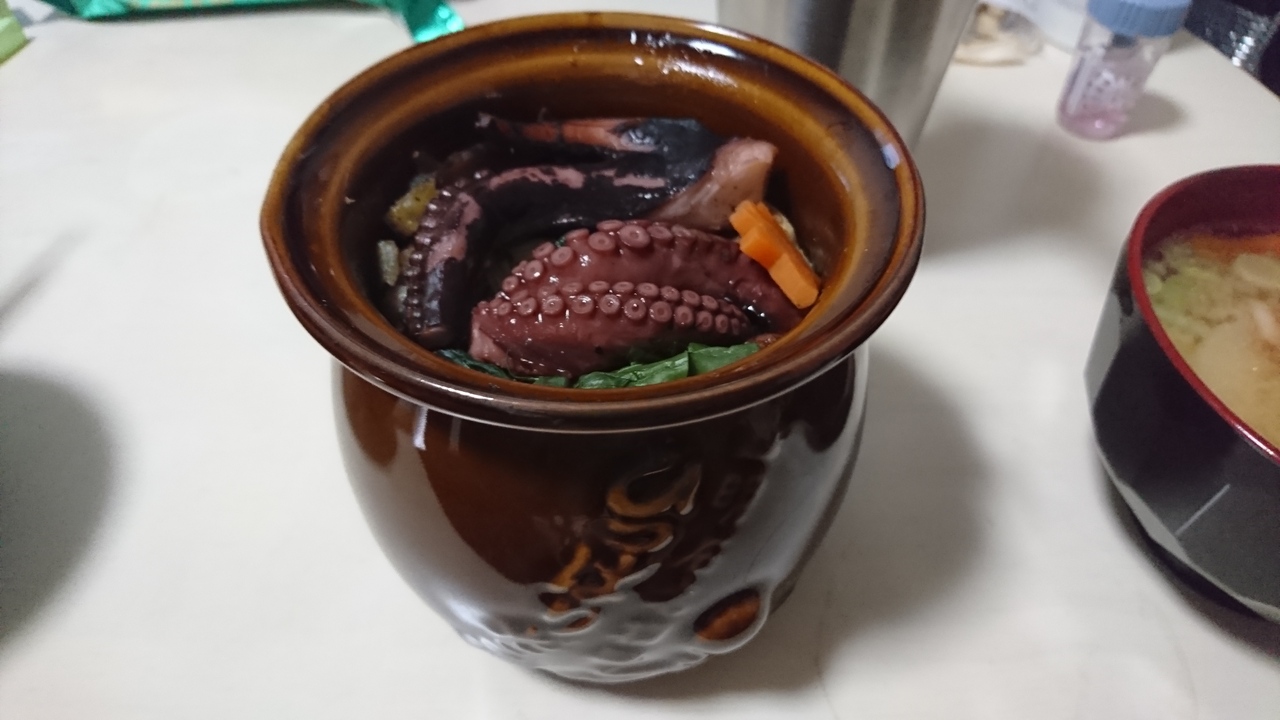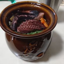 茶色いツボに入ったタコ飯で、タコの他に野菜やタケノコ、タコの天ぷらが入ってます。