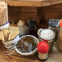 ラーメンはあっさり豚骨ですね。卓上には高菜や紅生姜などおなじみのトッピングもあり、味の変化も自在です。
