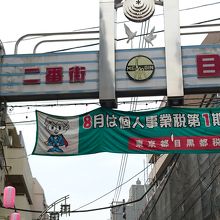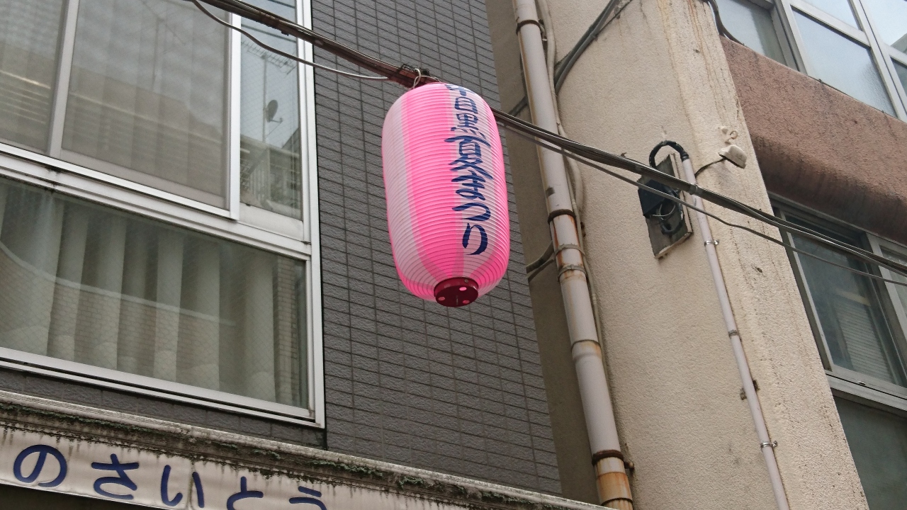 中目黒駅からすぐのところ、昔ながらの商店街といった風情でした。夏祭りが近いらしく提灯がつり下げられて華やかな雰囲気も漂っていました。東京はアーケードのない商店街が多いそうですが、ここもアーケードはありませんでした。