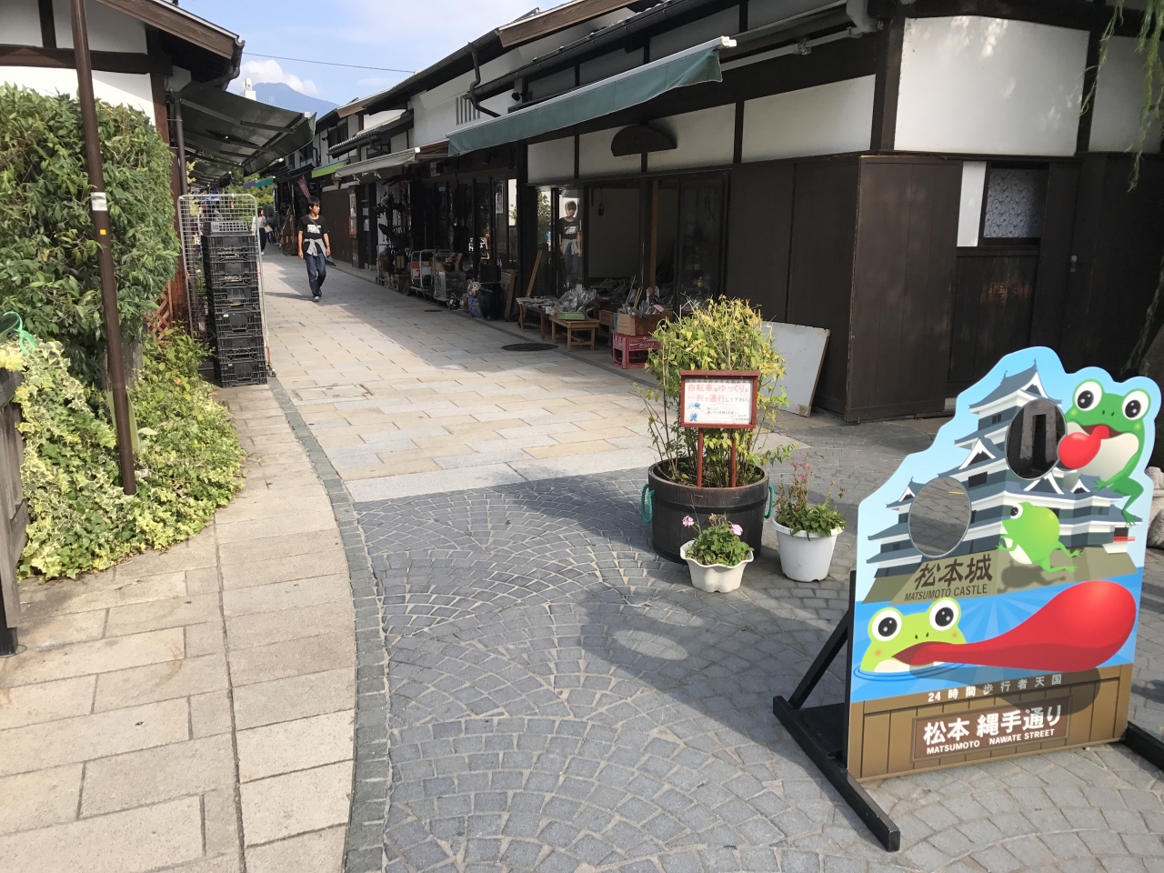 松本市の女鳥羽川沿いに広がる商店街です。歩行者専用で、建物の雰囲気がよくて昔にタイムスリップしたかのような風情が味わえます。通り沿いにはたい焼き屋さん、雑貨店、花屋さんなどが並び、商店街というよりも観光スポットとしてにぎわっていました。カエルがこの通りのシンボルです。