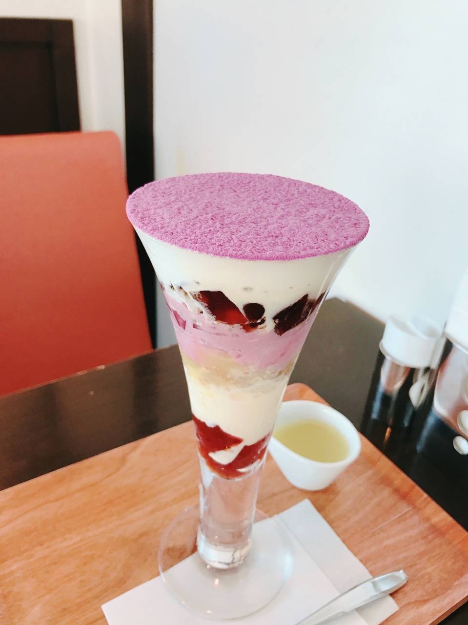 季節限定の紫いもと林檎のパフェは見た目は派手ですがパフェとしての完成度は少々厳しいものを感じました。