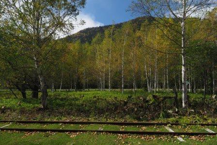 駅名標は廃線後に整備されたものですけれど、ホームは当時のままの姿できれいに朽ちつつあります。線路跡両脇には白樺の林が延び、さらに並行して国道が三股~三国峠~上川へと延びています。ホームの端に佇んで眺める白樺の、また美しいこと。