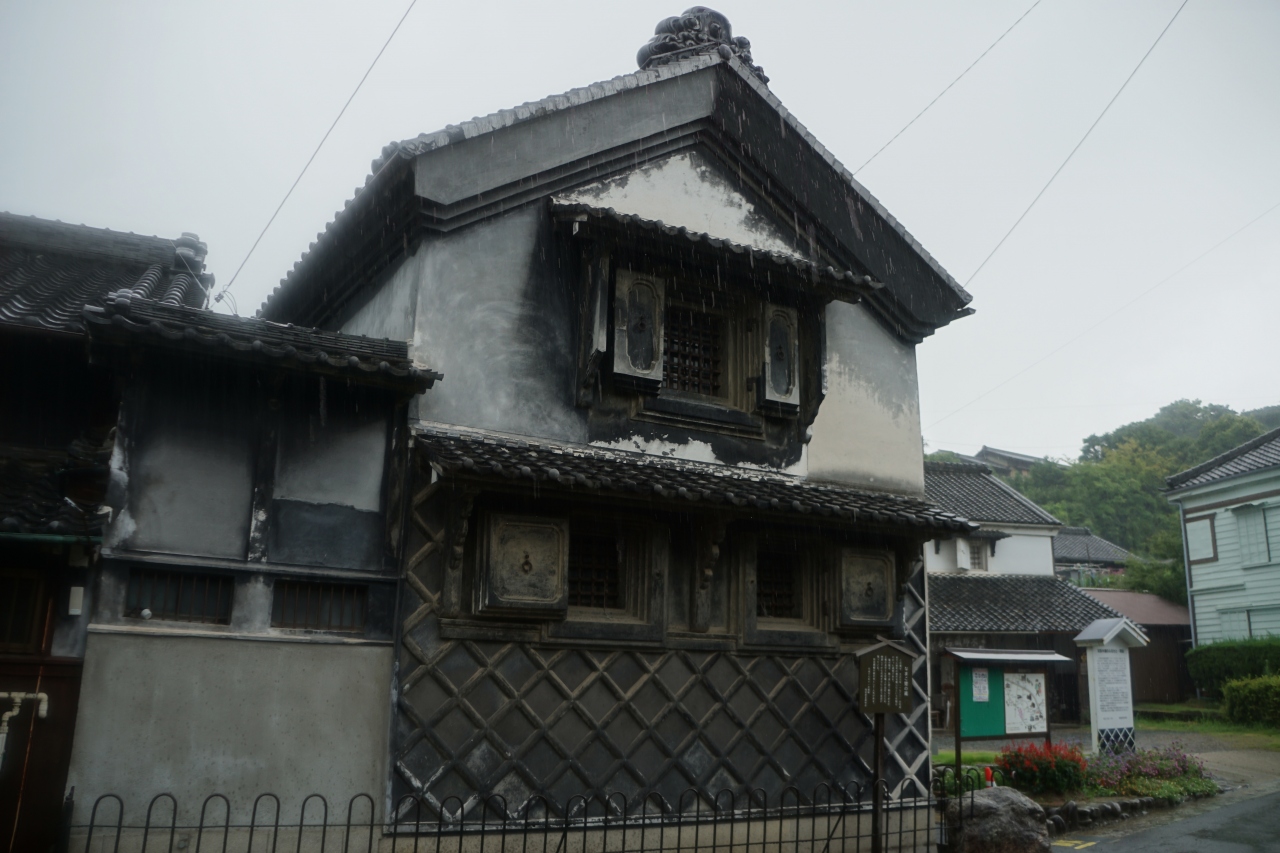 この蔵の特徴は、手の込んだなまこ壁ですが、何だか全体に黒ずんでいるのが不自然な感じ。これは戦時中、空襲を避けるために黒塗りされたことがあって、その跡だそうです。