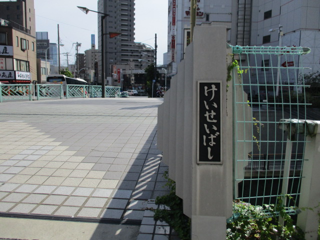 浅草通り押上駅前交差点から四つ目通りへ向かうと東京スカイツリー前を流れる北十間川に架かる橋が京成橋です。京成橋は昭和7年(1932年)架橋で名の由来は近くに京成電鉄の本社があった事からです。現在の橋は昭和37年(1962年)に架け替えられたもので綺麗で歩きやすいです。東京スカイツリー真下にあるこの橋から巨大なスカイツリーを見上げると迫力があり見ごたえありますのでお奨めです。
