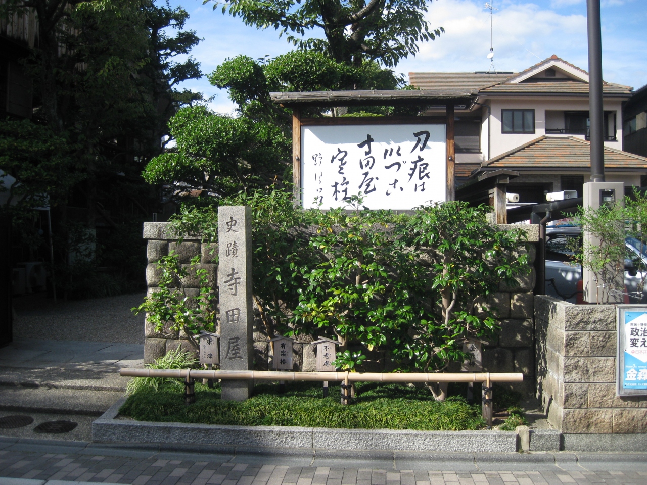 伏見酒どころの宇治川派流に架かる蓬莱橋の北詰にある船宿。坂本竜馬が定宿として、また薩摩藩士の乱闘で有馬新七以下9名が命を落とした寺田屋事件の旅籠としても知られます。幕末の激戦鳥羽伏見の戦いで建物は焼失し、現在は再建された建物です。かつての建物跡に史跡庭園の趣で竜馬像が建ち、薩摩藩士の碑も並んでいます。日本を変えた幕末の志士の息吹を感じる場所です。また周辺には土佐藩邸跡や会津藩屯所跡等遺跡が多くあり酒だけでなく幕末を味わえます。