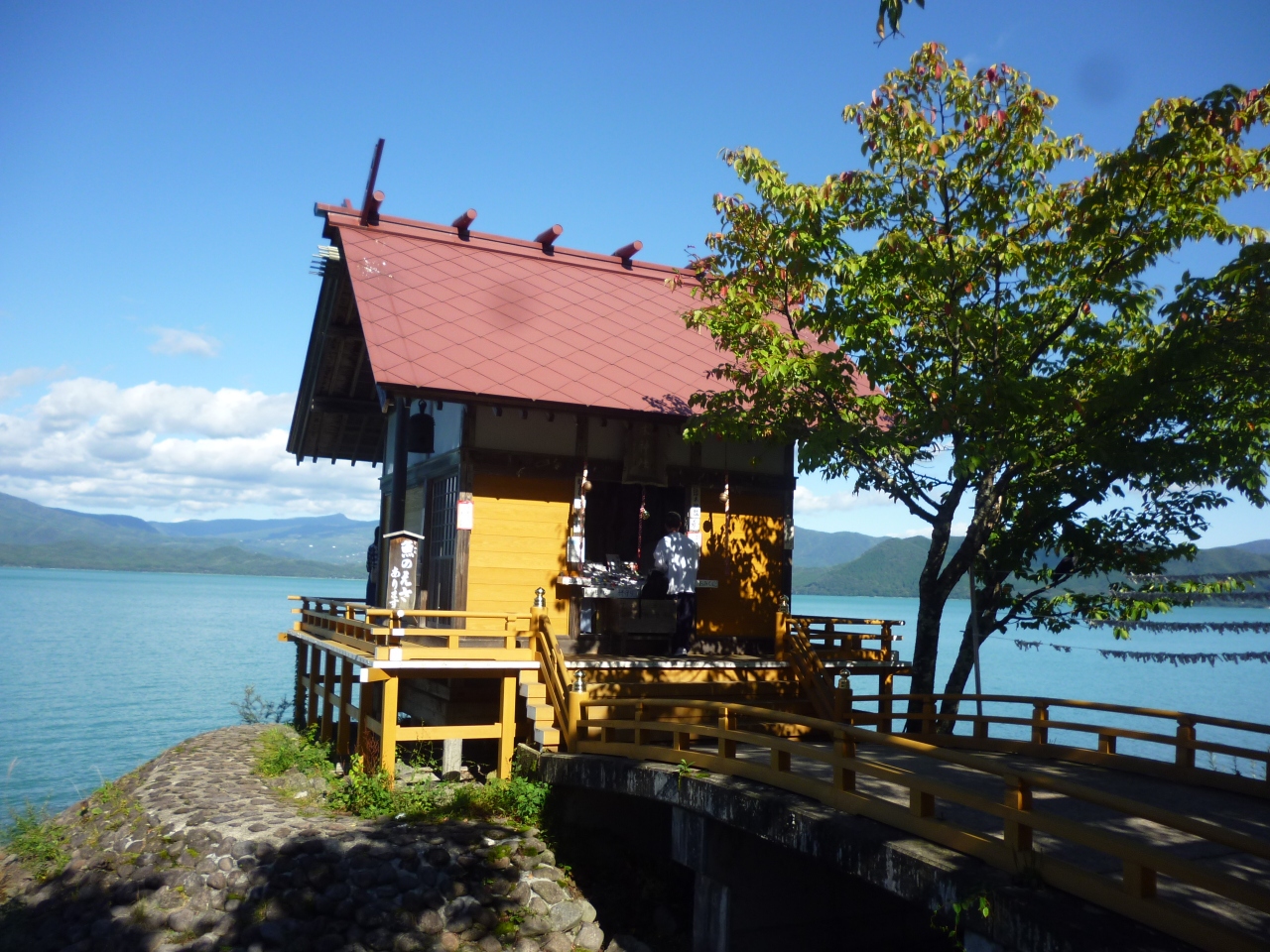 たつこ像の右側に、田沢湖に張り出すように、赤い屋根の小さな社の神社があります。縁結びのご利益があるそうです。湖に架かる太鼓橋を渡って参拝しました。神社の裏側にも回ることができ、見晴らしがよく田沢湖がきれいに見えました。