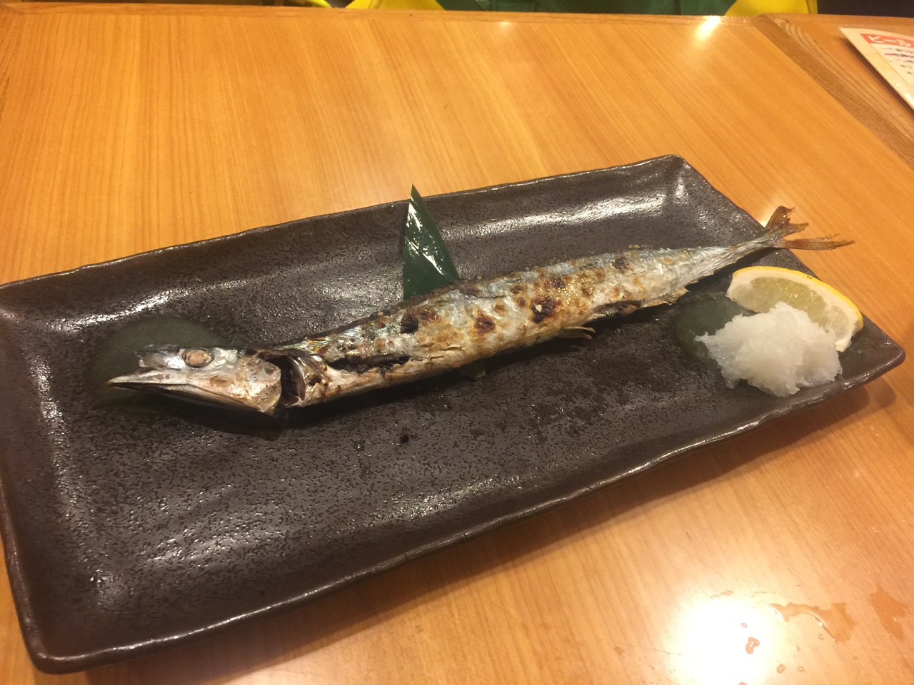 ツマミは刺身の盛り合わせ!カツオ、サーモン、マグロ、タコ!秋刀魚の塩焼き!