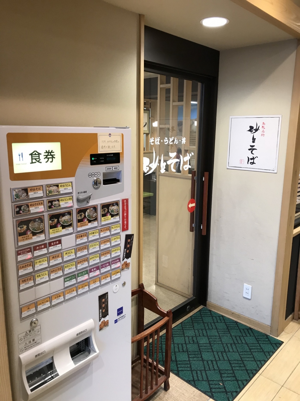 食券を購入して、店内のカウンターかテーブルええ食べるスタイル。店名の砂丘そばを注文。普通のかけ蕎麦に竹輪が2切れ乗ったオーソドックスなそば。出汁は美味しいが、そばはぐにゃぐにゃで残念な感じ。無理して立ち寄る必要はない。