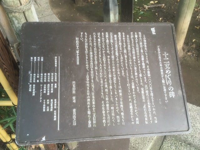 旅行する先々でいろいろな神社を参拝しましたが、御神木の周囲を干支が囲んでいるなんて…初めて見ました。その干支の像はブロンズ像のように光沢を帯びていて、いかにもご利益がありそうな感じでした。私も自分の干支を起点に参拝させていただきました。御神木もとても立派でしたし、この神社の境内には見どころもたくさんあります。旧東海道の川崎宿の宿場内にありますし、川崎大師にも近いことから、かつては多くの人の信仰を集めていたものと想像されます。
