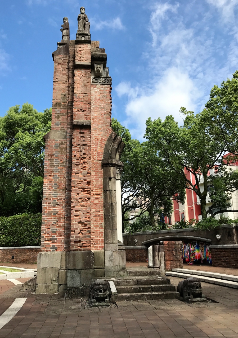 東洋一の壮大さを誇った浦上天主堂ですが、昭和20(1945)年8月9日午前11時2分の原子爆弾の炸裂によって破壊され、僅かに壁の一部が残るのみとなりました。その後昭和33(1958)年に再建された際に現地に移設されました。壁上に残る石像はザベリオと使徒であり、天主堂の遺構として非常にわかりやすいものとなっています。しかし原爆の発した膨大なエネルギーを受けた遺構の痛み具合はたいへんおおきなものであり、加えて風雨に晒されることを含めた経年劣化が進むことにより安全性の問題が出てきたために内部及び表面の補強が行われ、現在に至っています。