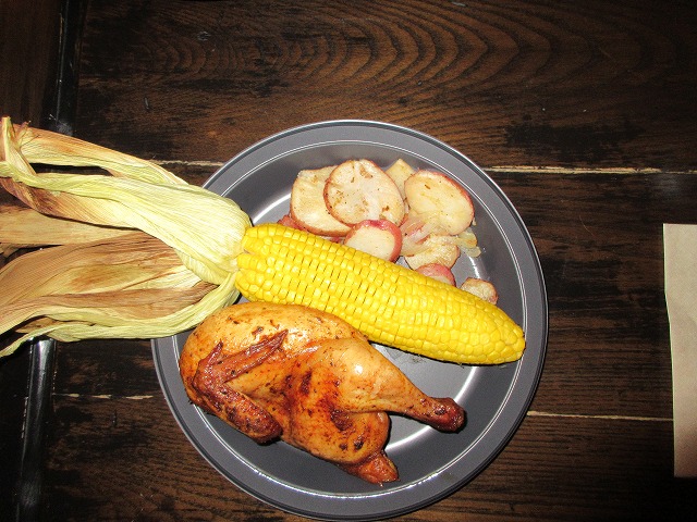 ユニバーサルスタジオジャパンで人気のハリポタエリア、「ウィザーディング・ワールド・オブ・ハリー・ポッター」でひと遊びした後、腹ごなしに入ったレストランが「三本の箒」でした。入り口周辺は暗く、一瞬、レストランかどうか迷います。名物のバタービール、英国伝統のフィッシュ・アンド・チップスやシェパーズパイなどもありましたが、お腹が減っていたこともあって「ロティサリー・スモークチキン皮付きコーン、ローストポテト添え」を注文しました。チキンが結構なボリューム。付け合わせのローストポテトの量もたっぷりで十分にお腹を満たすことができました。ところで、TDLもそうだけど、レストランの照明がどうも暗い。せっかくのご馳走なのに、ストロボをたかないと撮れないなんて寂しい限りです。お味の方だけど、もうちょっと濃い方が好きかも。