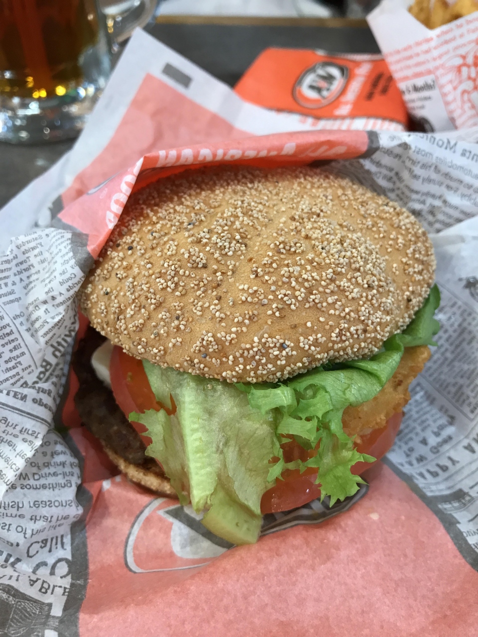 出されたハンバーガーはボリューム満点ですね。胡椒が効いた豚肉あり、クリームチーズあり、揚げ物まではさまっていたような。くるくるのカーリーフライも旨かったです。ケチャップやマスタードもセルフで利用でき、味の変化できるのもいいですね。