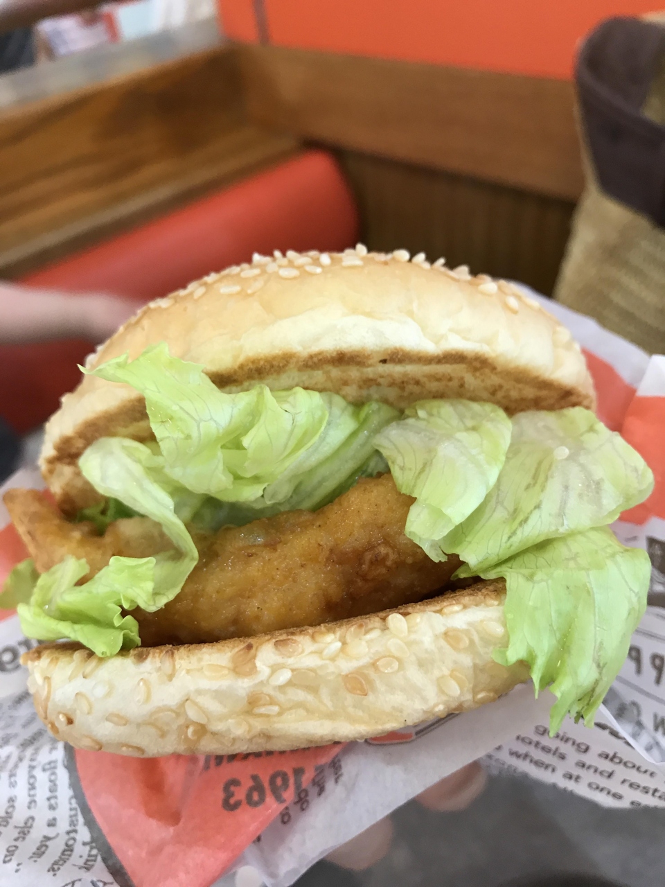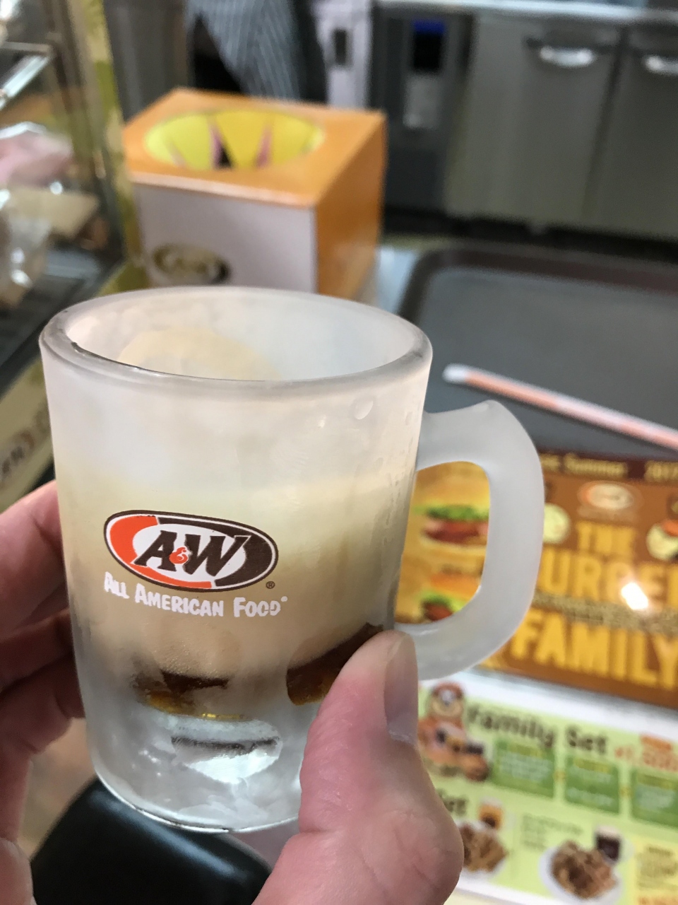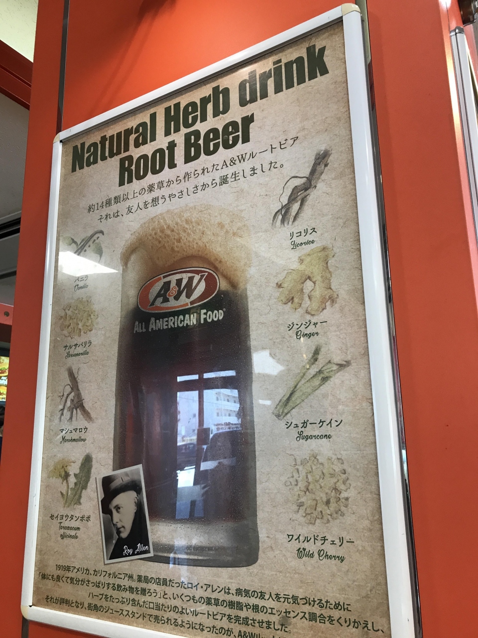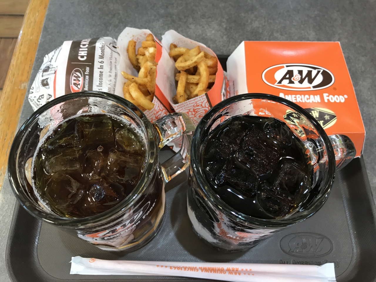 そして選べるドリンクは挑戦しようと思っていたルートビアをオーダー。ところが、店員のお姉さんさから“飲んだことありますか?試飲できますよ?”と、優しい提案が。もちろんで“是非”とお願いすると、ミニミニジョッキにルートビアを注いでくれました。飲んだ感想は、私はあの「甘い湿布味」が割と行けた。が、割と、なので経験としてはこれで充分。コーラにしました。