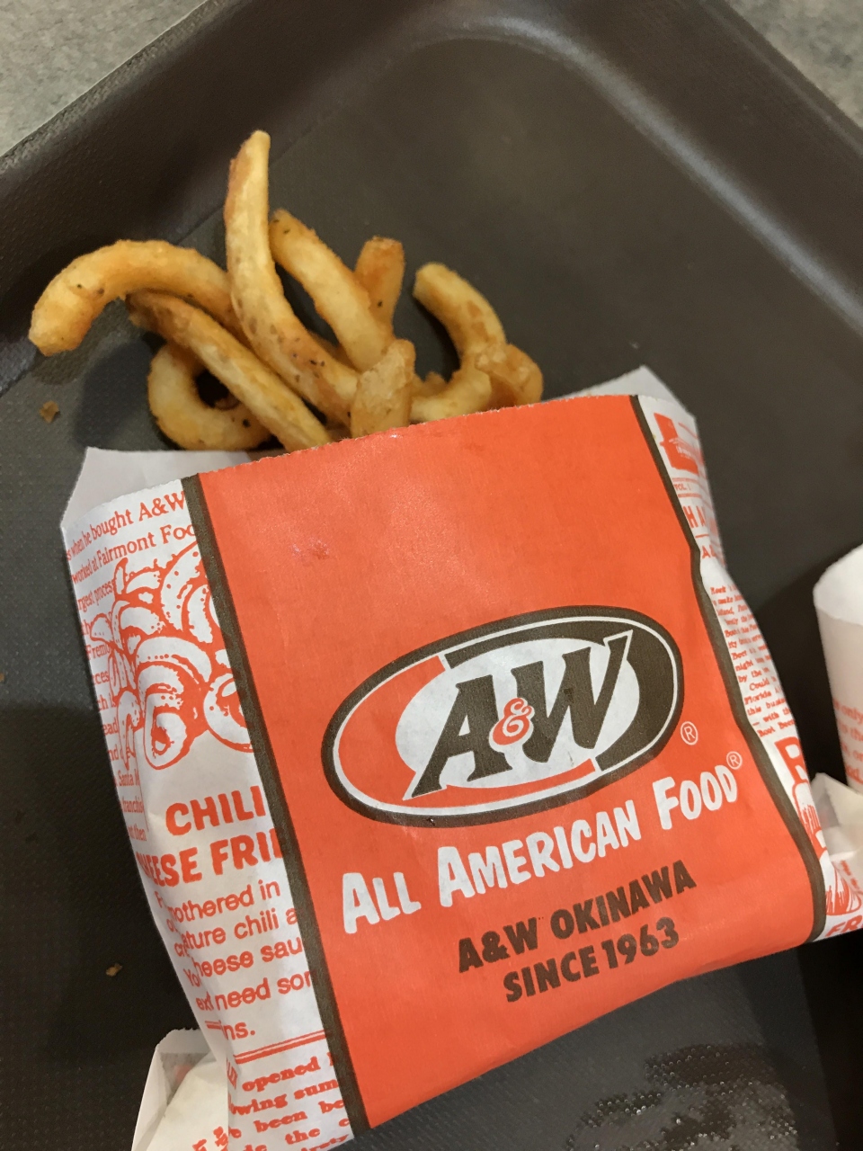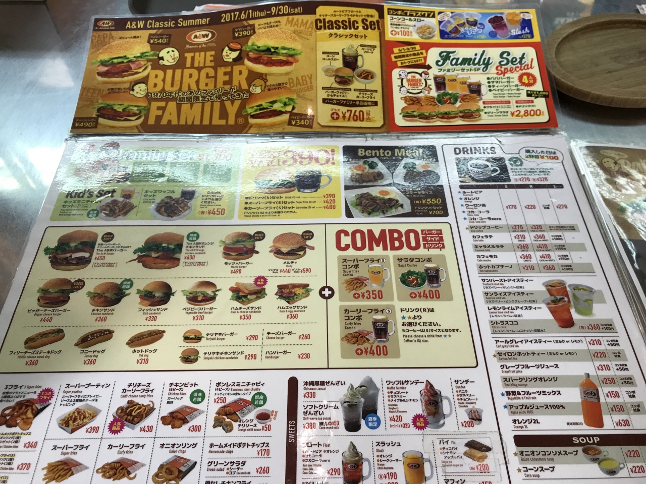 店内はサーティワンと共同スペース。メニューを見ましたが、とりあえず店員さんに「イチオシを」と聞き、The A&Wバーガー@650円+スーパーフライコンボ@350円にしました。高いけど。