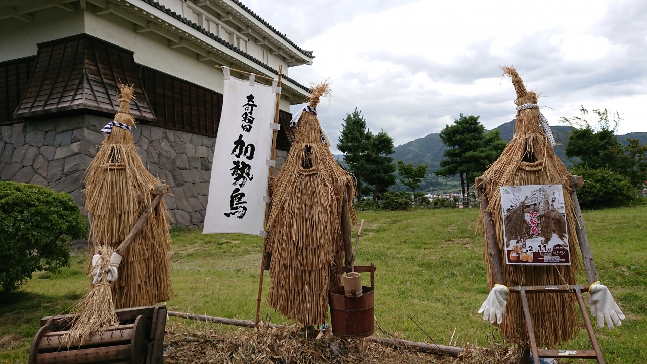 加勢鳥というのは上山で2月に開催されるお祭りで、人がケンダイというミノのようのものを被り、その加勢(人)に水をかけて五穀豊穣や商売繁昌などを祈る上山独自の行事だそうです。秋の実りを無事迎えたからでしょうか、かかし祭りにそのケンダイが展示されてありました。