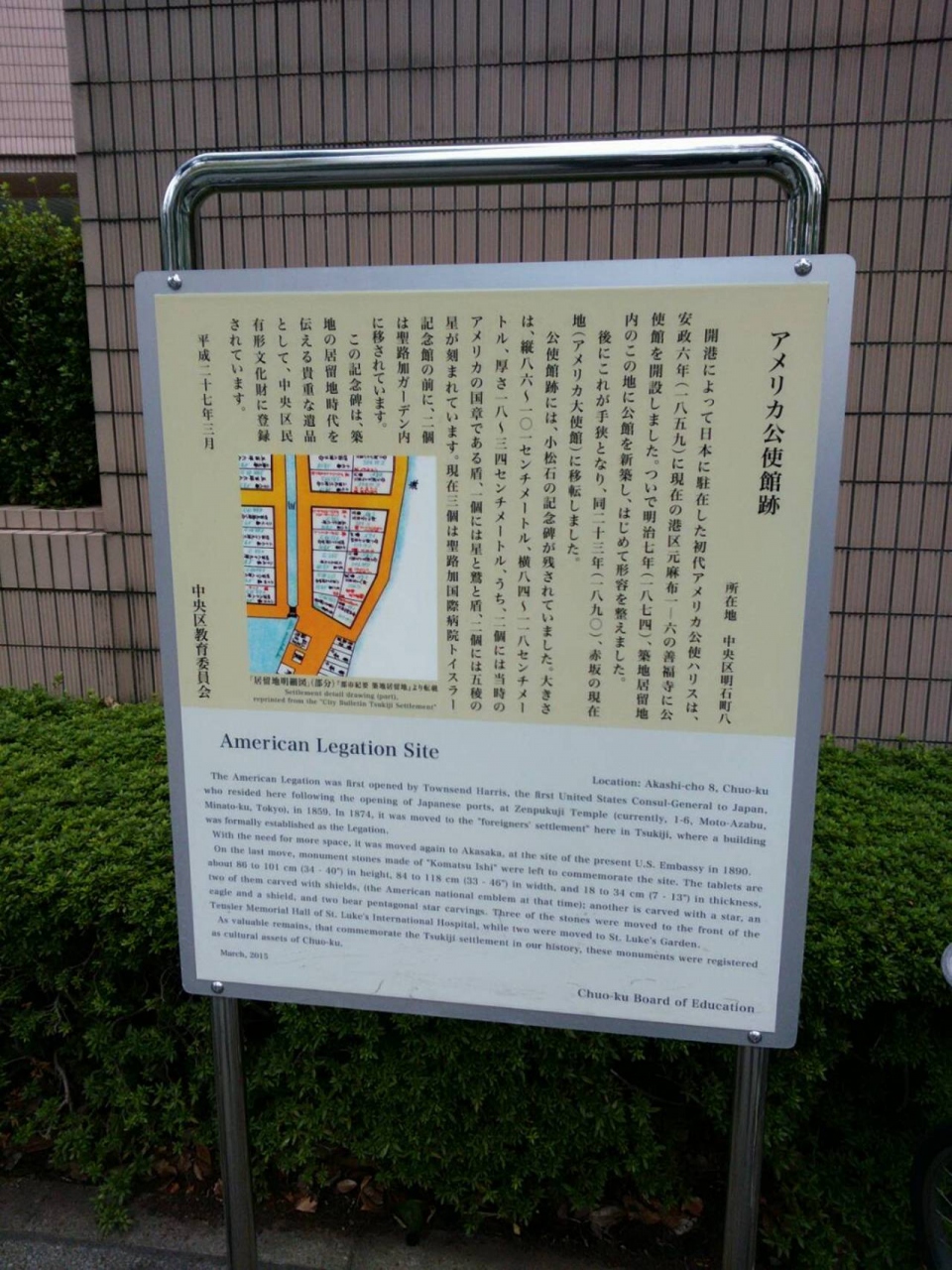 聖路加タワーの入口付近に案内板がありました。アメリカ公使館は、1875年(明治8年)に初代アメリカ行使ハリスにより外国人居留地内のこの地に建てられたそうです。現在は、聖路加タワーが建っているので、当時の面影は全くありませんが、歴史に触れるには良い場所なのでオススメです。