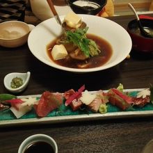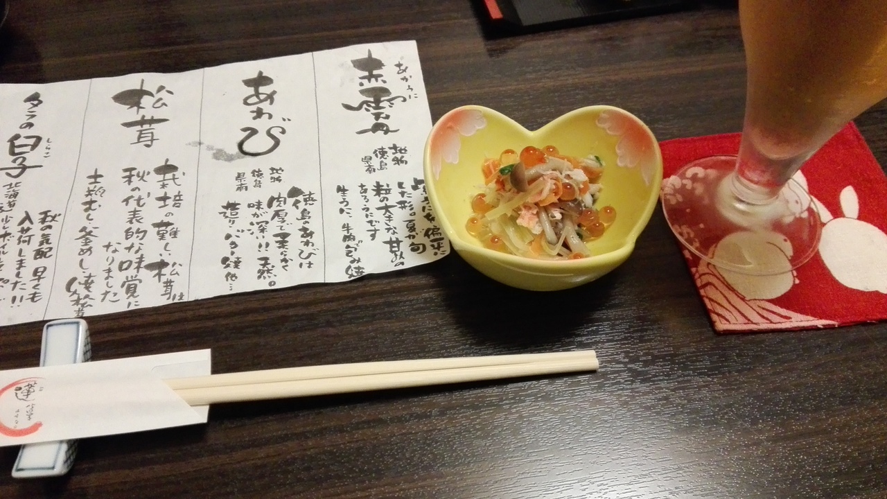 メニューが沢山あり、上品で美味しいのに驚きました。レンコン饅頭がもっちりと初のお味、おつくりは長ーいお皿に、味も飾りもよし、松茸の土瓶蒸しにスダチが合う、アラカルトで一杯頂き、気づくとおなか一杯です、お値段もそれなりですが、東京だときっと高くて食べられないような感じ。上品な関西風のお出しの和食がいろいろと食べられます、お寿司もあります。お酒は徳島の地元のが甘口で濃厚でした。手の込んだ美しい料理の数々でした。徳島の和食、おそるべし、でした。