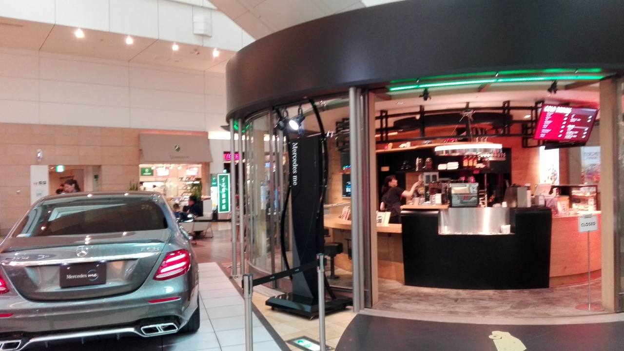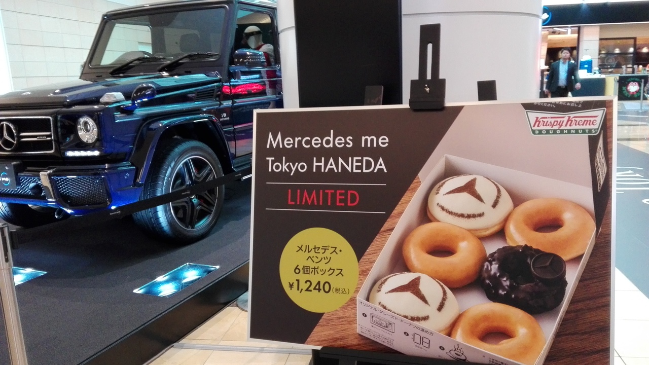 羽田空港国内線第2ターミナル、ANAに乗る前に、モノレールを降りて立ち寄る場所。いつも違うベンツが展示されているので、目立つ場所。ベンツのマーク入りのドーナツがあったので驚き。ベンツ乗っている友人へあげたいな、都内ではクリスピードーナツのお店が減り続けているので、空港にあると安心。いつもこのあたりでドーナツか隣のエッグセレントバイツのエッグタルトを買っています。