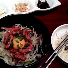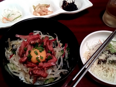 ハーフでもオーダー可能だったので、ローストビーフのユッケ丼と、ユッケジャンうどんで。