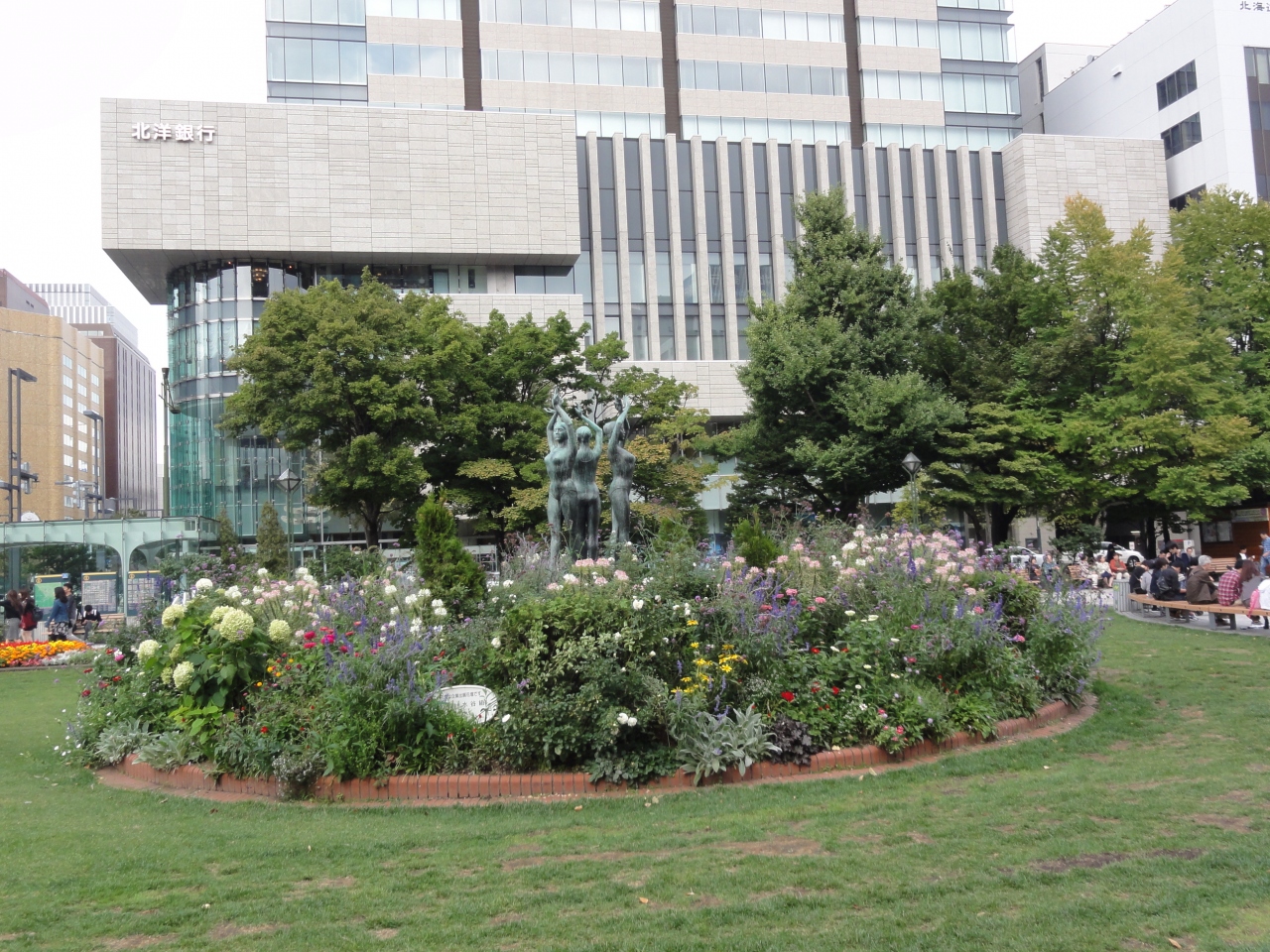 大通公園にある像です。かなり昔から見たことがあると思っていたら、1959年にニッカウィスキーの寄贈で設置されたものでした。なぜ「泉の像」という名かわかりませんが3人の踊り子は清々しい姿でスクッと立ってます。足元の草花は季節感はありますが、ない方が良いかなと思えました。